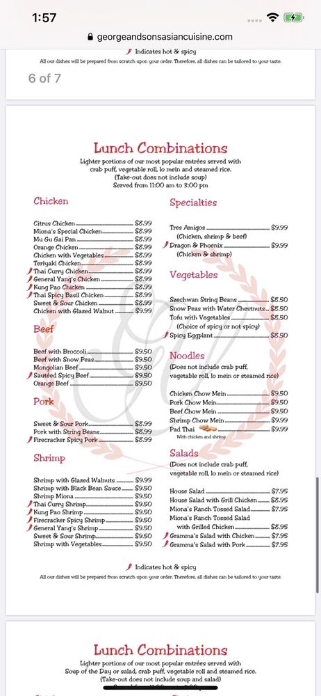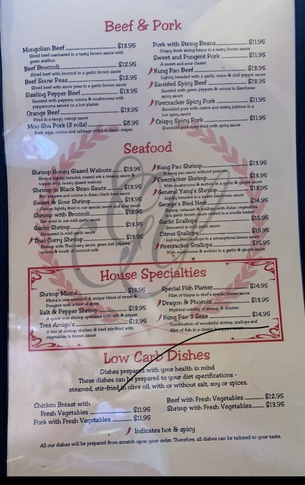 George & Son’s is a Chinese Asian fusion restaurant located in Phoenix, AZ, known for its wide range of chicken, beef, and pork dishes. The menu includes popular items like Orange Chicken, Mongolian Beef, and crispy Spicy Pork. Customers rave about the generous portion sizes and flavorful dishes, with one reviewer mentioning that the Orange Chicken could feed four people. The restaurant has a casual atmosphere with free Wi-Fi, outdoor seating, and a full bar. The staff is attentive and friendly, creating a relaxed dining experience. While some dishes received mixed reviews, overall, George & Son’s offers a great value for tasty Chinese cuisine. Whether you're looking for a quick lunch or a group dinner, this restaurant is worth a try for fans of Asian fusion flavors.